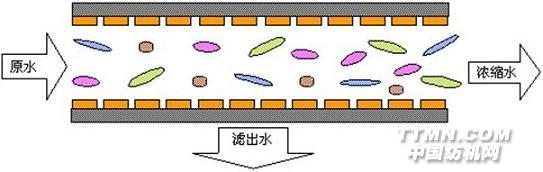 工作原理 一般認(rèn)為MF的分離機(jī)理為篩分機(jī)理,膜的物理結(jié)構(gòu)起決定作用。此外,吸附和電性能等因素對截留率也有影響。其有效分離范圍為0.1-10μm的粒子,操作靜壓差為0.01-0.2MPa。微孔濾膜的截留機(jī)理因其結(jié)構(gòu)上的差異而不盡相同。(a)在膜的表面層截留; (b)在膜內(nèi)部的網(wǎng)絡(luò)中截留微濾能截留0.1~1微米之間的顆粒,微濾膜允許大分子有機(jī)物和溶解性固體(無機(jī)鹽)等通過,但能阻擋住懸浮物、細(xì)菌、部分病毒及大尺度的膠體的透過,微濾膜兩側(cè)的運(yùn)行壓差(有效推動(dòng)力)一般為0.7bar。