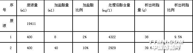 2. 工藝條件實驗 根據實驗,提出如下工藝流程: 酸析-->氧化-->中和-->稀釋-->排放 2.1酸析 酚醛樹脂在生產中會產生一定量水溶性樹脂,在蒸餾時,隨水分揮發出來,進入廢水,一方面造成樹脂損失,另一方面造成廢水中酚含量增高,廢水中的樹脂經測定約含10%,每噸廢水可回收1000 × 10% =100kg(約2000元)。因此,從廢水中提取出這部分樹脂意義非常重大,不但可以去除一部分酚,而且回收的樹脂價值可觀。根據酚醛樹脂在加熱或酸性條件下,可以聚合而從水中析出的特點,提出了用酸析的方法提取樹脂。我們在廢水中加入一定量的工業鹽酸,經過24小時反應,使樹脂與廢水分離,實驗情況如下表: