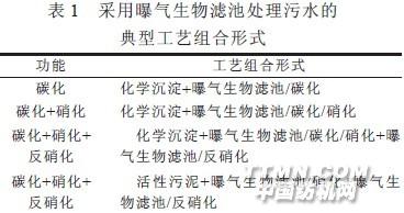 1 曝氣生物濾池工藝曝氣生物濾池(Biological Aerated Filter, BAF)是一種新型高負(fù)荷淹沒式三相反應(yīng)器, 它兼有活性污泥法和生物膜法兩者優(yōu)點。將單個曝氣生物濾池看作是一種處理工藝單元,因此按濾池功能可劃分為單純的除碳濾池、除碳/硝化濾池、除碳/硝化/反硝化濾池等。由此可根據(jù)該工藝的運行特性、處理領(lǐng)域的不同, 采取適當(dāng)?shù)慕M合形式, 完成碳化、硝化、反硝化、除磷等工作。目前, 曝氣生物濾池已經(jīng)從單一工藝逐漸發(fā)展成為系列綜合工藝。曝氣生物濾池已被廣泛地應(yīng)用于城市污水, 小區(qū)生活污水, 生活雜排水和食品加工廢水, 釀造、造紙等高濃度廢水處理。表1是采用曝氣生物濾池處理污水的典型流程。