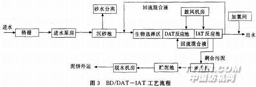 DAT-IAT工藝和傳統SBR工藝一樣,雖然在處理污水方面都有很多的優點,但同時也存在一些不足之處。DAT-IAT工藝最大的缺點就是除磷效果差,因此,針對這個問題,在DAT-IAT工藝的基礎上開發了BD/DAT-IAT工藝。工藝流程如圖3所示。