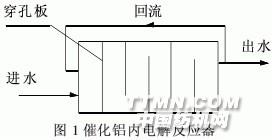 1.試驗方法 1.1 試驗水質(zhì) 試驗所用廢水取自邯鄲市某廢水站調(diào)節(jié)池出水(以印染廢水為主),試驗中通過濃硫酸調(diào)節(jié)印染廢水的pH值。試驗水質(zhì):COD為 1200~1350 mg/L,BOD為150~200 mg/L,色度為500~700倍。 1.2試驗材料 催化鋁內(nèi)電解法所用鋁片和催化材料銅片均為市售薄片,剪成細條狀備用。試驗所用藥品均為分析純。 1.3試驗裝置 催化鋁內(nèi)電解反應器為推流式,采用有機 玻璃制作,有效容積約10L,沿水流方向設有上、下過流擋板。裝置內(nèi)裝有一定比例(鋁銅質(zhì)量比為5:1,總質(zhì)量為960g,)混合均勻的鋁/銅片。試驗裝置見圖1。