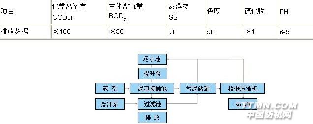 該廠滿負荷生產(chǎn)是四排污水約4000M3,生產(chǎn)中使用的染料主要為分散染料和直接染料。活性染料和硫化染料使用較少,污水水溫不高,漿料主要用樹脂漿料。 污水經(jīng)過泵提升進入脈沖泥渣接觸反應器,通過該設備內(nèi)部泥渣層的吸附,緩沖和添加藥劑的反應去掉污水中的污染物,澄清污水自流入反應粒度沉淀池,去除較細小的懸浮物,脈沖泥渣接觸反應器的多余泥渣排入污泥罐,經(jīng)過濾的污水進入活性炭塔,出水可達標準排放。 該方法的處理流程簡單,操作管理方便,動力消耗低,藥劑用量小,對水質(zhì)突變有一定的緩沖能力,但處理效率稍低。 設計出水水質(zhì):按《紡織染整工業(yè)廢水污染物排放標準》(GB4287-92)中1992年12月31日之前立項的紡織、染整工業(yè)建設項目及建成投資的企業(yè)排放標準執(zhí)行。 單位:mg/l (PH 色度除外)