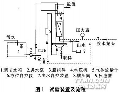 1.2試驗裝置采用兩套完全相同的裝置(分別記作ln}2#)進行試驗。工藝流程見圖1反應器為有機玻璃制成,直徑為200mm,高為2m,內置孔徑為0.2um、膜面積為0.5m2的聚偏氟乙烯中空纖維膜組件。依重力間歇出水,由液位自控儀控制反應器內水位基本恒定。