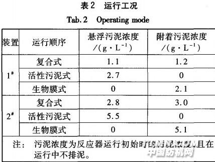 1.3試驗方法l#、2#裝置的氣水比分別為30:1和60:1,HRT和操作壓力均相同(分別為5h,10kPa),依次按三種不同類型的膜生物反應器運行,每種反應器開始運行前均對膜組件進行清洗。運行工況見表2