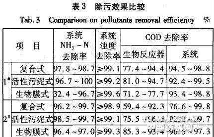 2結果與分析2.1對污染物的去除效果三種一體式膜生物反應器在兩種運行工況下的除污效果見表3
