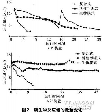 從表3可知,三種一體式膜生物反應器對氨氮、濁度和COD的去除率都很高,但生物反應器去除COD的效果相差較大,相比較而言活性污泥一膜生物反應器的去除效果更穩定些。 2.2膜通量的下降趨勢三種一體式膜生物反應器出水量的變化情況如圖2所示。在兩種運行工況下均是生物膜一膜生物反應器的膜通量下降速度最快,復合式膜生物反應器次之,活性污泥一膜生物反應器的膜通量下降速度最慢;對于同一種類型的膜生物反應器而言,第二種運行工況下的膜通量下降速度較慢。