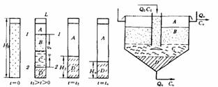 二沉池污泥、混合污泥及高濁度廢水在沉淀池中的沉降特性,如圖6-6所示。即沉降開始后,立即出現(xiàn)清水層A,它與下面的懸浮B(渾液面)之間有一個明顯的界面,在圖中表示為1-1面。懸浮層B為受阻沉降層,該層內(nèi)濃度均勻,在形成1-1面的同時,沉淀池底部出現(xiàn)密實(shí)層D,其中懸浮物濃度也是均勻的;B層與 D層之間是過渡層C,其懸浮物濃度由上向下逐漸增加,C與D層之間分界面稱為2-2面。1-1面以vs速度下降,2-2面以v速度上升,從沉降開始,歷時t2后,兩個面相遇,C層消失。此時D層濃度變?yōu)镃,處于臨界濃度,此時D層開始壓縮。