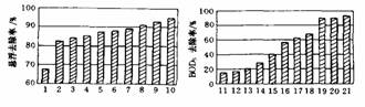 一、二級沉淀池中,采用折流沉淀,安裝污泥回流裝置。不加混凝劑。懸浮固體及BOD的去除率如圖所示。