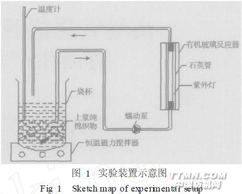 服裝學院) ,上漿純棉織物(江南大學紡織服裝學院) , Nafion 膜( Sigma2Aldrich) 。1. 1. 2 儀 器721分光光度計(江蘇無錫市科達智能儀器廠) , pH23C型酸度計(杭州亞美電子儀器廠) ,電熱恒溫水浴鍋(江蘇醫療器械廠) , 8122型恒溫磁力攪拌器(上海司樂儀器有限公司) , BT002100M型蠕動泵(保定蘭格恒流泵有限公司) ,紫外燈( GL26 W )( Sankyo Denki, Tokyo) 。1. 2 模擬退漿實驗方法實驗裝置如圖1所示,所有的催化反應都在環流式反應器內進行。環流式反應器為圓柱形,材質為有機玻璃,高238 mm,外徑50 mm,內徑36 mm,操作時內置長223 mm,外徑26 mm,內徑23 mm的石英玻璃管,反應器總體積為116 mL,有效光照體積為75 mL,蠕動泵流速為170 mL /min。模擬退漿時在燒杯中加入上漿純棉織物,織物PVA上漿量為60 mg左右,棉織物在攪拌子的作用下隨退漿液旋轉,開啟蠕動泵,接通中壓汞燈( 254 nm) ,以加入H2O2 時刻為初始反應時間( t = 0) ,每隔15 min取樣,取樣體積為12 mL,按1. 3. 1所述方法進行樣品預處理,然后再進行PVA含量的測定。