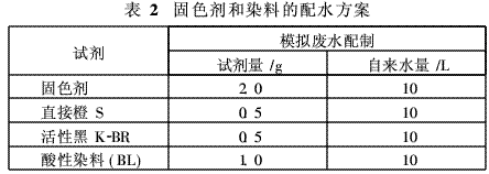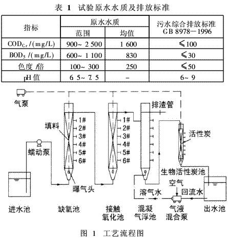 試驗裝置及主要參數如下:(1)進水池 采用聚氯乙烯塑料箱,容積50L。(2)缺氧池、生物接觸氧化池 有機玻璃制,內徑100mm,高1.0m,有效容積6.28L,采用組合纖維填料。(3)混凝氣浮池 有機玻璃制,內徑100mm,高1.0m。考慮混凝劑經濟性、可行性及應用經驗,采用聚合氯化鋁(PAC)和氯化鐵進行試驗。(4)生物活性炭池 有機玻璃制,內徑50mm,高1.0m,有效容積1.42L。活性炭采用柱狀凈水炭,主要性能指標:碘吸附值≥1000mg/g,耐磨強度90%。(5)進水采用電子蠕動泵,可實現無級調速。(6)充氧由氣泵通過底部的多孔砂芯曝氣器進入缺氧池、生物接觸氧化池及生物活性炭池。1.3 試驗方法(1)連續生化試驗每天取絲綢印染廢水至進水池,用蠕動泵提升至缺氧池進行連續生化處理,調整工藝運行參數并取樣分析。經缺氧-接觸氧化-混凝氣浮單元處理的廢水流入生物活性炭池,定期取樣分析。(2)混凝試驗采用生物接觸氧化池出水進行混