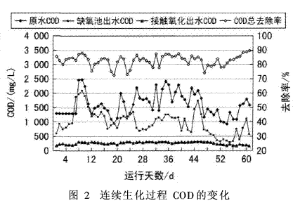 1.4 測試方法水質檢測均按國家標準分析方法及國家環保局組織編寫的《水和廢水監測分析方法》(第四版)進行。2·結果與分析2.1 連續生化試驗連續生化試驗歷時3個月,其中填料掛膜馴化期約30d,馴化穩定期可觀察到粘附在填料上的生物膜結構密實、污泥絮體成球狀。對生物接觸氧化池內的填料進行顯微鏡觀察,若發現有大量菌膠團存在,說明生物膜基本馴化成功,污泥沉降性能良好,可進行連續試驗。試驗結果見圖2。