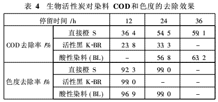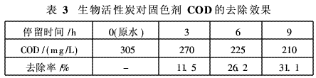 由表3和表4可知,生物活性炭對染料COD的去除率達50%以上,對固色劑COD的去除率在30%以上。研究結果也表明,難降解物質經活性炭吸附調節及催化作用后,需要有足夠的時間完成微生物降解過程[2]。因此,難降解物質結構及停留時間是影響生物活性炭去除率的重要因素。表4表明,對于絲綢印染廢水中的主要難降解物質,在相應的停留時間條件下,采用生物活性炭深度處理可達到較好的去除效果。對色度的去除率達到90%以上,可較好地解決絲綢印染廢水的脫色問題。2.3.2 混凝氣浮出水的深度處理絲綢印染廢水經連續生化處理后,進入混凝氣浮單元,采用組合工藝,最終出水作為回流溶氣水,回流比為20%~30%。由于溶氣水的稀釋作用及氣泡對混凝絮體的粘附截留作用,混凝氣浮單元對廢水COD的去除率達到30%~40%。混凝氣浮出水COD為170mg/L左右,再經生物活性炭處理, 出水COD基本達到排放標準要求。處理效果見圖3。