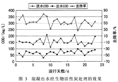 由圖3可知,生物活性炭的處理效果受進水水質影響,COD去除率會出現波動。這可能是進水有機污染物濃度較