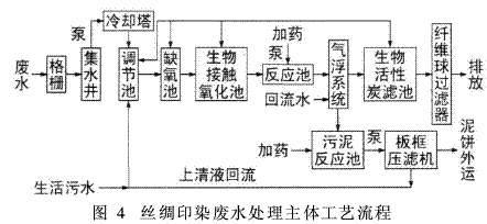 由表5知,該工程調試穩定后,運行情況良好,出水CODCr≤100mg/L,色度≤10倍,BOD5≤10mg/L,達到國家《污水綜合排放標準》GB8978—1996的一級標準。4·結論(1)缺氧-生物接觸氧化處理系統對絲綢印染廢水COD有較好去除效果,進水COD為900~2500mg/L時,出水COD低于300mg/L,平均去除率為82%。系統對進水COD的變化具有較好的適應性,能夠適應絲綢印染廢水COD波動大的特點。(2)生物活性炭對進一步去除絲綢印染廢水中的難降解物質有較好效果,對染液色度有較高的去除率,是深度處理絲綢印染廢水的有效途徑之一。(3)采用缺氧-接觸氧化-混凝氣浮-生物活性炭組合工藝處理絲綢印染廢水,處理效果穩定,實際工程運行良好,出水水質達到國家《污水綜合排放標準》GB8978—1