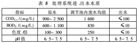 由于廢水水溫較高,需先經冷卻塔冷卻后,再進入調節池。調節池內廢水由泵輸送至生物缺氧池,自流入生物接觸氧化池進行生化處理。處理后的出水經混凝反應池后先進入氣浮處理系統,再進入生物活性炭濾池和纖維球過濾器進行深度處理,處理出水達標排放。收集氣浮池中的污泥,進入污泥反應池,由污泥脫水機進行脫水,脫水后的污泥含水率為75%左右。3.2 處理系統進出水水質為保證微生物系統的穩定性,工程設計中在缺氧池前設置了調節池,原水、調節池內廢水及處理后的出水水質見表5。