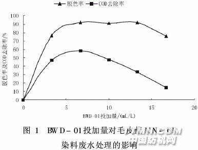 2 結(jié)果與討論 2. 1 BWD-01對毛皮藍(lán)MN-DR染料廢水的處理 2. 1. 1 BWD-01的投加量對廢水處理效果的影響B(tài)WD-01稀釋至10%用于試驗,模擬水樣濃 度為1. 0 g/L,測定吸光度的最大吸收波長為 416nm,結(jié)果如圖1。