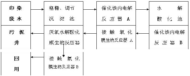 絕大多數印染廢水,經格柵、調節沉淀池——催化鐵內電解反應器A——水解酸化池——催化鐵內電解反應器B——接觸氧化膜生物反應器A——厭氧水解酸化膜生物反應器——接觸氧化膜生物反應器B處理,足以使其COD去除99%以上、BOD去除99.5%以上、SS去除99%以上、色度去除95%以上,完全達到回用標準;對于活性艷紅K2—BP、酸性紅G、活性黑K—BR等少數難生物降解染料廢水,必要時可單獨增加獨創的光催化氧化膜反應器,亦可確保完全達到回用標準。