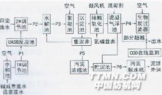 2 改造方案的確定2.1對水質的分析及工藝的選擇 經測定,原水中堿堿量廢水的CODcr高達20 000以上、pH值≈13;退漿廢水的CODcr,高達15 000、pH值≈12。經熱水、冷水沖洗后,COD cr仍為3 500~6 500。這兩部分水量占全部印染廢水的lO%左右,屬高濃度有機廢水。如果按照傳統方法,將它們與其它印染廢水混合處理,顯然不科學,也不經濟。改造時擬將其分流,進行局部預處理(酸中和之后),然后再與其它印染廢水混合處理。 本公司化纖染色所占比例較大,其印染廢水可生化性較差,僅依靠好氧生化工藝(如接觸氧化法或活性污泥法)處理,很難達到預期效果。如果在好氧生化工藝處理前進行厭氧(兼氧)水解處理,可利用厭氧(兼氧)細菌降解能力強的特點,將廢水中的大分子有機物(如化纖原料、活性染料等)轉化為小分子有機物,將難降解的物質轉化為易降解的物質,從而提高廢水的可生化性,可為后續好氧處理創造條件。對中高濃度印染廢水采用厭氧(兼氧)生化預處理,有利于去除色素(包括活性染料類)及有機污染物的毒性。 鑒于物化預處理中投藥較多、污泥量大、成本高,若水中無機鹽(特別是Ca2+)濃度增加,后續曝氣池中組合填料上會出現板結并粘滿較硬的泥垢,使其比表面積大大降低,從而阻礙微生物膜的形成和脫落,降低了生化處理效果。因此,將先物化后生化的工藝路線改為厭氧(兼氧)一好氧生化工藝路線,運用硝化和反硝化技術實現污泥的消化,可減少混凝劑用量,大大降低污泥產量和處理成本。2.2工藝流程的確定(圖2).jpg)