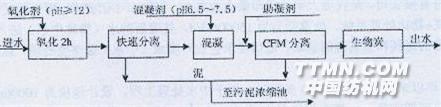 λ:360nm,L=1cm(水)722型光柵分光光度計以上不難看出,當pH值≥12時,脫色率達50%以上,pH值11時,脫色率不到20%。2、時間由于生化以后的污染物以水溶性有機物為主,而以表面活性劑為多,通過空氣氧化可部分去除,但過長的時間,無疑增加運行成本,本工藝氧化時間為2h。3、共存離子的影響在印染過程中,由于加入了大量的無機鹽,無疑增加了廢水的電離度,對絮凝極為不利,所以不能以Na0H調(diào)節(jié)pH值,應選用Ca0并添加少量Mg鹽。4、ss的影響作為化學絮凝,最終是以懸浮物的形式實現(xiàn)泥水的分離為目的。因而,SS去除越徹底,處理效果越好。處理中采用專用藥劑和專門的分離技術以配合工藝。
