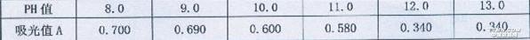 三、工藝及其討論為驗證工藝可靠性,試驗中把污染物去除和脫色作為主要指標進行考核,說明工藝可行性。1、反應條件工藝中,氧化時控制pH≥l2,時間為2h,運行證明,反應條件對處理效果有著較大影響。當pH≤11時,污染物的平均去除率小于20%,當pH≥l2時,則出現(xiàn)一個突躍,去除率達50%以上。加入氧化劑后,沉淀速度加快,脫色效果增加。為考察在不同pH值下的脫色效果,選取360nm處作為測定波長,測定處理前后的吸光值,按吸光值變化計算脫色率。見表3表3反應條件對脫色率影響