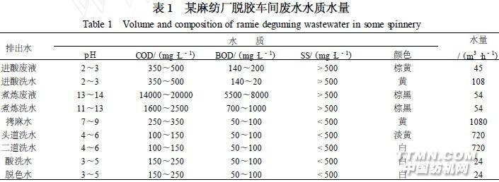 脫膠過程排除的廢水有浸酸廢液、浸酸洗水、煮煉廢液、煮煉洗水、拷麻水、漂洗水、脫色水、油浸水,除浸油廢水考慮另行處理外,其它各種廢水的水質(zhì)、水量見表1。