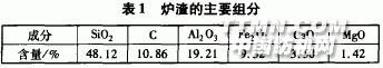 1 試驗部分1.1 試驗設備與方法 試驗設備721型分光光度計,2 ooo mL過濾柱。方法印染廢水(取自某紡織印染廠經生物氧化的出水),原廢水色度200(倍),CODc,為220 mg/L,加人絮凝劑絮凝,經沉降后,上層清水再經高溫爐渣過濾。爐渣的主要組分見表1。
