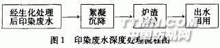 O 前言 印染廢水中含有各種染料、整理劑和表面活性劑等,目前處理方法主要采用生物降解法,此外,還有吸附法、絮凝法、化學氧化法和電解氧化法¨ 等,也得到了開發和應用。利用活性炭吸附處理印染廢水雖然簡便易行,處理效果也較好,但由于活性炭再生困難,處理費用較高,難以普及推廣;生物法對可溶性染料中的氮、磷元素去除效果差;而絮凝法是去除COD、降低色度的有效方法之一,但對水溶性染料的去除效果差,通常采用化學氧化法配合處理。吸附法由于吸附劑再生容易,處理費用有所下降,但由于印染廢水所含成分復雜,采用單一樹脂處理很難得到滿意效果。本項目討論了采用絮凝一爐渣吸附過濾法深度處理印染廢水的過程,研究了影響處理效果的各種因素,并得到了適宜的工藝條件,處理出水可直接作為印染工藝用水。