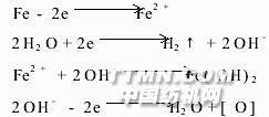 2 試驗部分2.1 試驗原理 采用兩個由薄鐵板制成的圓筒形消耗性電極。在電極之間加上適宜的直流電壓后,將電極置入需脫色的染料溶液內,電解槽內發生電化學反應。陽極板發生氧化反應,Fe失去2個電子變成二價鐵離子溶解進入電解液中;陰極板發生還原反應,水電解生成的氫離子得到2個電子變成氫氣;電解液中的2價鐵離子與水離解成的氫氧根離子生成大量氫氧化亞鐵。其大比表面積和高活性決定了它具有極強的吸附性,吸附廢水中的染料,達到廢水脫色的目的;電解液內另一部分氫氧根離子向陽極移動,并在陽極放電,生成新生態氧,它也是一種很好的脫色劑[2]。電解槽內發生的化學反應如下: