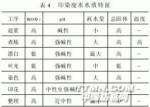 2.4 整理廢水 整理廢水通常含有纖維屑、各種樹脂、甲醛和漿料等,雖然其COD值較高,但它的廢水量很小,對整個廢水的水質影響不大。印染加工各道工序水質特征如表4。