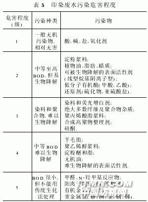 3 危害 由于印染工業涉及到許多有害化學藥品,這類廢水有機物含量高、色度深、成分雜、有害物質含量高、對水體會造成嚴重危害,紡織印染廢水對環境和人類的危害引起了越來越多的人的關注。紡織印染廢水中主要污染物根據危害程度可分為1~5級,1級最輕微,5級最嚴重,具體如表5。