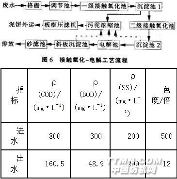 石家莊某紡織經(jīng)編廠采用的電解池既工藝簡單,又運行管理方便,克服了混凝氣浮或沉淀工藝的復(fù)雜,其中電解池是集氧化還原、混凝、氣浮于一體的多功能處理裝置。在電解池的作用下,一方面污泥物在陽極失去電子或在陰極得到電子發(fā)生氧化或還原反應(yīng);另一方面廢水中的物質(zhì)如Cl-,被電解成ClO-,氧化廢水中的污染物,即所謂的間接氧化;而鐵陽極發(fā)生溶蝕,產(chǎn)生的鐵陽離子對廢水中的膠體物質(zhì)、細(xì)小懸浮物、大分子有機物等就有絮凝的作用。該工藝流程見圖6,處理效果見表4。