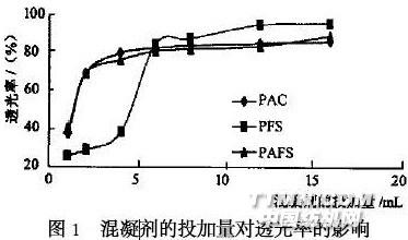 本文比較了3 種常用的混凝劑處理活性染料廢水的工藝條件及脫色效果,發(fā)現(xiàn)這3 種混凝劑對印染廢水的處理效果相似。并將PAM分別與這3 種混凝劑聯(lián)用處理印染廢水,證實(shí)PAM 的加入可以大大提高污泥沉降速度,從而提高印染廢水的處理效率,節(jié)省處理費(fèi)用。1 實(shí)驗(yàn)部分1. 1 實(shí)驗(yàn)儀器及材料 DJS —11 型定時變速攪拌器,721 分光光度計(jì),PHS —2 型酸度計(jì)。 聚合氯化鋁,聚合硫酸鐵,聚合硫酸鋁鐵(均為無錫西漳環(huán)保藥劑廠產(chǎn)品) ,固體顆粒,使用時配制成5 %的水溶液;聚丙烯酰胺,陰離子型,使用時配制成0. 1 %的水溶液,由蘇州環(huán)保設(shè)備公司提供;活性染廢水由江陰染整二廠提供,pH 值為11~12 ,COD 的值為627 mg/ L ,透光率為21. 5 %。1. 2 實(shí)驗(yàn)方法1. 2. 1 混凝實(shí)驗(yàn)方法 在1 000 mL 的燒杯中加入500 mL 印染廢水水樣,用5 %鹽酸溶液調(diào)節(jié)溶液的pH 值,邊攪拌邊加入混凝劑,控制轉(zhuǎn)速為220 r/ min ,攪拌5 min ,再以70r/ min轉(zhuǎn)速慢攪5 min ,靜止20 min 后取其上清液,用721 分光光度計(jì)在最大吸收波長處測出透光率。1. 2. 2 平均沉降速度的測定 在100 mL 量筒中,加入100 mL 的廢水及2 mL 的混凝劑,邊攪拌邊調(diào)節(jié)溶液的pH 值,混凝充分后,停止攪拌,按動秒表,分別在不同的時間間隔下,讀出污泥下降的高度,并最終計(jì)算出污泥沉降的平均速度。2 實(shí)驗(yàn)結(jié)果及討論2. 1 最佳投藥量的確定 固定溶液的pH 值為7. 0 時處理印染廢水,加入不同量的藥劑,得到透光率與投藥量的關(guān)系如圖1。從圖1 可看出,PAC 和PAFS 的投加量對透光率的影響極其相似,若投加量小于4 mL (即400 mg/ L) 。從圖1 也可看出,PFS 的最佳投加量為600 mg/ L 。從圖1 也