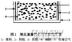 隨著印染和染料工業的迅速發展, 印染和染料廢水所帶來的污染問題日益嚴重, 這類廢水具有水量大、成分復雜、難降解的污染物含量高、色度深等特點[ 1~ 3 ] , 因此它們的脫色處理一直是個難題。目前通常采用的方法有吸附、混凝、氧化、還原、電解、生化等[ 4, 5 ] , 這些方法都有其自身難以克服的缺點, 且一般只能處理色度較低的廢水, 根本無法解決高色度印染廢水的脫色問題。 作者應用了氧化絮凝復合床(O x ido2F loccu la2t ion Reacto r, O FR) [ 6 ]水處理新技術處理高色度印染廢水和染料廢水。該技術采用三維電極原理[ 7 ] , 并配以催化氧化技術。在一定的操作條件下, 利用裝置內產生的氧化能力極強的羥基自由基(?OH ) [ 8 ]和新生態的混凝劑將染料氧化分解, 并發生吸附、混凝等物理化學作用, 使染料迅速去除, 達到了滿意的脫色效果, CODCr去除率也較高。1 實驗部分1. 1 實驗裝置 氧化絮凝復合床裝置的槽體為長方體, 其液流方向與電流方向垂直, 如圖1 所示。槽體為PVC 材料, 下部裝有銅質穿孔管以通入壓縮空氣, 以鐵作材料的電極極板, 分別緊貼在兩側的槽體壁上, 用尼龍篩網或纖維紙板做隔膜分開電極與填料, 避免它們接觸導電而導致短路, 填料用過渡金屬元素的合金作基體, 均勻混以5%~ 10% 催化劑, 配以適量的其他輔助劑(粘結劑、疏松劑等) 而制成一定粒徑的顆粒狀物料(粒子電極) [ 6 ] , 裝入兩極板間的槽體內。極板表面做適當的處理, 與隔膜一起放入實驗裝置內。經篩選合適的填料用稀酸浸泡幾分鐘, 用自來水沖洗干凈后使用。實驗時將填料瀝干, 并將填料均勻充填于實驗裝置內, 加入待處理的廢水, 通入一定流量的壓縮空氣, 接通電源, 調節電壓至所需值, 反應一定時間后取樣進行分析。