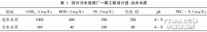 。印染廢水具有水量大、有機(jī)污染物含量高、色度深、堿性大、水質(zhì)變化大等特點(diǎn),屬難處理的工業(yè)廢水。[1]浙江某地區(qū)輕紡、印染業(yè)發(fā)達(dá),據(jù)統(tǒng)計(jì)僅一個(gè)縣就有印染企業(yè)156家。近年來由于化學(xué)纖維織物的發(fā)展,仿真絲的興起和印染后整理技術(shù)的進(jìn)步,使PVA漿料、人造絲堿解物(主要是鄰苯二甲酸類物質(zhì))、新型助劑等難生化降解有機(jī)物大量進(jìn)入印染廢水,其COD濃度也由原來的數(shù)百mg/L上升到2000~3000mg/L,從而使原有的生物處理系統(tǒng)COD去除率從70%下降到50%左右,甚至更低。傳統(tǒng)的生物處理工藝已受到嚴(yán)重挑戰(zhàn);傳統(tǒng)的化學(xué)沉淀和氣浮法對(duì)這類印染廢水的COD去除率也僅為30%左右。因此開發(fā)經(jīng)濟(jì)有效的印染廢水處理技術(shù)日益成為當(dāng)今環(huán)保行業(yè)關(guān)注的課題。浙江某污水處理廠集中治理印染廢水,該污水處理廠一期工程采用厭氧、好氧+物化處理工藝,其處理規(guī)模較大,在國內(nèi)屬首例。該廠于200年5月開始調(diào)試,2004年12月投產(chǎn)運(yùn)營至今。1 一期工程設(shè)計(jì)進(jìn)出水水質(zhì)、水量該污水處理廠一期工程設(shè)計(jì)進(jìn)水水量為30萬m3/d,主要接納各企業(yè)生產(chǎn)廢水(其中印染廢水占50%以上)和生活污水,二者比例約為20∶1,由于各工業(yè)企業(yè)排放的污水水質(zhì)差異大,要求各企業(yè)先進(jìn)行單獨(dú)預(yù)處理,再由城市污水處理廠進(jìn)行“統(tǒng)一收集、處理、達(dá)標(biāo)排放”。排放標(biāo)準(zhǔn)須達(dá)到《紡織染整工業(yè)污染物排放標(biāo)準(zhǔn)》(GB4287—1992)中規(guī)定的二級(jí)標(biāo)準(zhǔn)。該廠一期工程設(shè)計(jì)進(jìn)、出水水質(zhì)見表1。