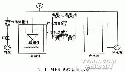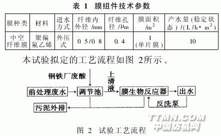 常州市某印染廠的前處理車間,主要從事各種全棉和棉彈類梭織面料的前處理加工,包括煮練、燒毛、冷堆、漂白和絲光等工序,其中煮練、漂白和絲光工序會產(chǎn)生大量廢水。該車間產(chǎn)生廢水約150~400t/d,廢水水質(zhì)組分復雜,波動大,可生化性差,處理較困難。目前工廠對該車間廢水的處理措施為:與染色廢水混合→投加PAC(聚合氯化鋁,含Al2O39%)1.5‰(體積比),進行混凝處理→以鋼鐵廠廢酸調(diào)節(jié)pH值→進入生化池生化處理。但是,處理效果并不是很好,且因生化池進水COD值不穩(wěn)定,直接導致最終出水COD值在100mg/L左右波動,難以達到一級排放標準。針對印染前處理廢水水質(zhì),先用鋼鐵廠廢酸進行簡單預處理,再采用膜生物反應器(MBR)進行深度處理,以期使前處理廢水在與其它工序廢水混合之前,將其中的污染物質(zhì)即得以大幅去除,降低后續(xù)處理工序的污染負荷。1 試驗1.1 試驗裝置與工藝流程試驗裝置如圖1所示。