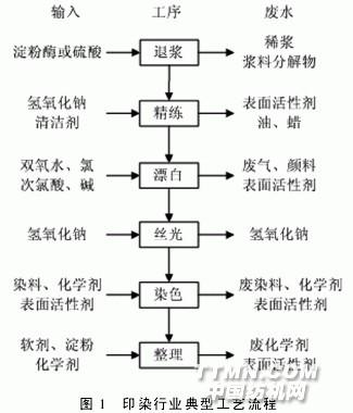 紡織工業(yè)在占世界1/5人口的我國,歷來是關(guān)系國計(jì)民生的重要產(chǎn)業(yè)。紡織業(yè)對(duì)于實(shí)現(xiàn)2020年的宏偉目標(biāo),有不可替代的歷史作用。我國紡織工業(yè)在滿足人民群眾日益增長的物質(zhì)文化生活需要的同時(shí),又以其較強(qiáng)的比較優(yōu)勢(shì),抓住國際產(chǎn)業(yè)結(jié)構(gòu)調(diào)整的歷史機(jī)遇,迅速開辟了國際市場(chǎng),并在1994年成為世界第一大紡織品服裝生產(chǎn)國和出口國,使紡織工業(yè)成為我國實(shí)現(xiàn)國際收支平衡的支柱產(chǎn)業(yè)。在當(dāng)代經(jīng)濟(jì)全球化和新科技革命的條件下,我國正在進(jìn)入由紡織大國變成紡織強(qiáng)國的時(shí)期。但同時(shí)也要看到,紡織印染行業(yè)是水污染大戶,研究、開發(fā)、推行低投入的水污染治理措施勢(shì)在必行[1]。1 印染工藝的污染源 在印染行業(yè)中所采用的原輔料、化學(xué)試劑及技術(shù)都有一定的差別,但基本工序是十分相似的。典型的印染過程一共有八個(gè)步驟:退漿、精煉、漂白、絲光、染色、整理、干燥及成品,其工序及污染物排放情況見圖1。由圖1可以看出,印染業(yè)主要污染源包括:在精練及染色中所用的酸、堿會(huì)導(dǎo)致廢水的pH值偏向極端;由于精練及染色工序均在高溫下進(jìn)行,因而產(chǎn)生高溫的廢水;廢水的高懸浮物主要來自退漿及精練工序所產(chǎn)生的毛碎、纖維及雜質(zhì);在退漿中所產(chǎn)生的淀粉、膠、蠟,使廢水中的BOD值提高,常用的乙酸等酸化劑也會(huì)提高BOD值;廢水中的COD主要來自聚乙烯醇(PVA)等化學(xué)漿料、各種染料及顏料。印染廢水的兩大污染源是退漿及染色(印花)工序,它們?cè)谡麄€(gè)印染工藝流程所產(chǎn)生的廢水中占有非常高的比重[1]。
