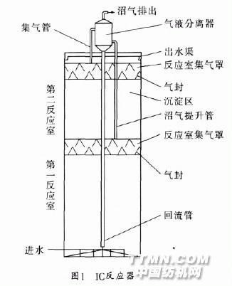 紡織纖維的雜質(zhì)、油脂、鹽類,以及加工過程中添加的漿料(淀粉或聚乙烯醇)、染料、助劑和酸堿等。2.2實(shí)驗(yàn)裝置作者根據(jù)國內(nèi)專家研究的IC的原理和主要構(gòu)造介紹〔3〕〔4〕〔5〕,結(jié)合實(shí)例,自己設(shè)計(jì)了一個IC反應(yīng)器,具體構(gòu)造見圖1。2.3實(shí)驗(yàn)過程