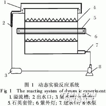 印染廢水產生于印染行業,是一種色度高、有機污染物含量高且組分復雜、化學需氧量(COD)和生物需氧量(BOD)高的廢水,其水質變動范圍大。一般印染廢水pH值為6~10,COD為400~1000mg/L,BOD為100~400mg/L,SS為100~200mg/L,色度為100~400倍[1]。除含有助劑和大量的漿料外,廢水中還含有苯胺、硝基苯、鄰苯二甲酸類等含有苯環、胺基、偶氮等基團的有毒有機污染物,不但難以生物降解,而且多為致癌物質,危及人的身體健康。納米TiO2光催化氧化法作為一種新興的水污染治理技術得到了國內外學者的廣泛關注,已發現印染廢水中有3000多種難降解的污染物可以通過納米TiO2的光催化作用使其降解。TiO2以其廉價無毒、導帶價帶電位合適、光腐蝕性小、無二次污染等諸多優點,成為多相光催化領域的熱點,并被認為是當前最具有開發前景的綠色環保型光催化劑,在降解廢水中的有機物方面具有廣闊的前景。1 實驗部分1.1 試劑與儀器氟鈦酸銨為化學純;硼酸、氫氧化鈉、鹽酸、無水乙醇等均為分析純;石英砂(粒徑7~10mm)。HH-S21.6六孔恒溫水浴鍋;SX-8-10馬弗爐。1.2 反應器1.2.1 靜態平行實驗 采用自制的鏡面反應器。反應裝置為用鏡面玻璃自行制作的矩形槽,規格500mm×150mm×50mm,實驗所用的燈安置在反應器的上方[2]。1.2.2 動態實驗 動態實驗反應器見圖1。
