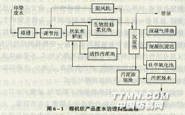 棉產品印染廢水整體屬于有機性廢水,而且具有城市污水、生活污水的某些特性,但其廢水的可生物降解性較差,并且還具有某些特殊顏色。早期采用較多的治理技術為生物治理技術中的活性污泥法,由于企業廢水治理量一般規模為2000—5000t/d,一般多采用表面加速曝氣形式。為了提高其處理效率,使運行更加穩定,又陸續開發了不同結構池型(圓形池、方形池)、不同工藝形式(合建式、分建式)的多種活性污泥法處理形式。由于當時棉紡印染產品主要以天然棉纖維為主,廢水可生物降解性能較好,因而處理后可獲得較為滿意的效果。隨后,引進當時國外先進環保治理技術并結合我國具體情況,開發出生物膜法的生物接觸氧化法、塔式生物濾池等生物轉盤法形式,并獲得較快的發展和應用。生物接觸氧化法實質上是生物膜法與活性污泥法的混合形式,國外又稱為浸沒式生物濾池法。由于在池中放置一定數量的、且具有一定孔隙率和比表面積的填料,為微生物的生長提供了棲息場所,具有明顯的生物膜法特點;同時它又采用了活性污泥法的曝氣方式,并在池體中和填料間也具有一定數量的活性污泥,因此它又具有活性污泥的特點。它采用鼓風曝氣形式,不受池體表面產生的泡沫影響,不產生污泥膨脹,有機負荷高,占地少,在棉印染行業的廢水治理中逐步取代了表面加速曝氣形式。 隨著棉印染產品中化學纖維數量的不斷增加,使廢水的可生物降解性能逐漸變差,使原有的生物處理系統去除能力有所降低。為了滿足達標排放要求,采用在生物化學處理方法之后再串接到化學處理的方式。化學處理中以化學投藥法為主,主要采用混凝沉淀和混凝氣浮的形式。采用生化與物化聯合的治理工藝,可以充分發揮生物處理法去除大部分有機污染物的能力,而其剩余的有機污染物和色度則由化學處理法承擔,這樣可以減少藥劑投加量,使處理成本降低。 1. 棉機織產品印染廢水治理 處理工藝難以將其氧化分解,現在常采用厭氧一好氧生物治理工藝。其中的厭氧法