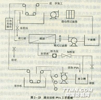 通常退漿水中PvA的含量在0.1%~1.5%(wt)之間,退漿水經過超濾處理后,透過水返回退漿浴,濃縮液進入混合槽,調整到合適濃度再用于上漿,整個PVA回收系統只外排一小部分透過水,以防止退漿浴聚集過量的低分子量組分;超濾的濃縮液濃度在8.O%一10.O%(Wt)之間,由回路中的折光儀自動檢測和控制,整個系統高度自動化。由于采用了超濾膜分離裝置,節省了退漿用水,減少了PvA的用量,具有節約水資源、回收有價值物質、減少環境污染的多重作用,經濟和社會效益十分顯著。膜的使用壽命對超濾膜法回收PVA的經濟性影響很大,選擇優良的膜材料、改進膜組器的結構、采用合適的清洗方法均可有效延長膜的使用壽命,通常超濾膜的使用壽命可達2年。開發高性能的分離膜和高效的清洗技術是目前的研究熱點。 美國采用超濾法從退漿廢水中回收PVA,取得了良好的經濟效益。現舉美國南卡羅來納州某廠實例。該廠PvA漿液的組成為:PVA9.5%,蠟0.5%,水90%。在使用了與圖2—24相似