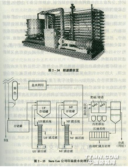在這套裝置中安裝了超濾和納濾系統,廢水處理能力為7.5一并將氯化鈉和凈水在染色工藝中再用。圖2—25是處理流程圖。350t/d。小型系統通過處理有色含鹽的廢水能有效地降低色度。這套設備有雙重排水管道系統,可以在稀釋的主體廢水中進行選擇性單獨回收,分離廢水的電磁閥由染液電腦控制,電腦給設備下達指令,使深色富鹽的廢水排放到一個獨立的容器中等待處理。