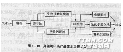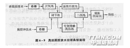 流程中格柵設(shè)置兩道,厭氧池采用UASB形式,停留時間為6一12h,采用常溫厭氧發(fā)酵,COD去除率達80%一85%。 調(diào)節(jié)池停留時間為6—8h。 生物接觸氧化池停留時間為4—6h,氣水比為18:1—20:1,一般采用二段法,COD去除率為60%左右。 活性污泥停留時間為8—10h,COD去除率為60%一65%。 二沉池沉淀時間為1.5—2h,通常采用豎流式。 (2)真絲綢印染產(chǎn)品廢水治理:天然真絲綢指以天然蠶絲為原料的各類產(chǎn)品,其廢水中除了天然絲綢上所含的蠟質(zhì)及漿料外,主要為染料和助劑。 通常采用的治理流程見圖6—10。