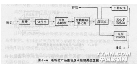 毛紡產品分為毛粗紡產品(毛呢、毛毯等厚型織物)、毛精紡產品(毛料等薄型織物)和絨線產品。 毛紡織產品廢水主要指毛粗紡產品、毛精紡產品和絨線產品在染色過程中產生的各種廢水的總稱,它包括染色殘液、漂洗水、洗呢水、縮絨水等。其中染色殘液和初次漂洗水中含有部分剩余染料及大部分或全部染色助劑,而其余各類廢水含污染物濃度較低。 毛紡織產品生產加工過程中主要污染源是染色。純毛產品染色過程中排放的染色廢水一般呈中性或弱酸性,毛紡染色混合廢水基本呈中性。 純毛產品染色廢水BODs/COD~<0.4,屬于易生物降解的廢水,而純毛與毛混紡產品并存的染色廢水BODs/COD~<0.3,屬于較易生物降解的廢水。因此,毛紡織廠產品的染色廢水總體上屬于可生物降解性較好的有機性廢水。此外,毛紡織產品所用的染料均為水溶性染料,在染液中呈離子狀態,羊毛又是蛋白質纖維,上染率高,殘液中染料含量較低,也易于被外加相反電荷的離子所中和,較易于脫色。 3.毛粗紡產品染色廢水治理 典型流程見圖6—6。