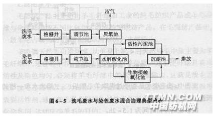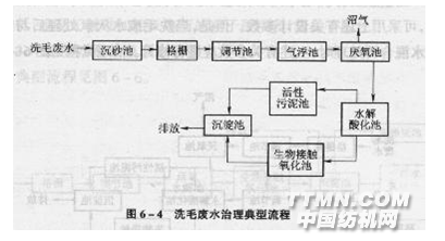 毛紡織產(chǎn)品主要是由羊毛纖維加工成的純毛紡織產(chǎn)品或羊毛纖維與化學纖維按不同比例加工而成的毛混紡產(chǎn)品。在毛混紡產(chǎn)品中,一般羊毛占較大的比例,而化學纖維所占比例較小。 羊毛屬天然蛋白質(zhì)纖維,從羊身上取下的天然原毛中除主要為羊毛纖維外,還含有羊汗、羊脂及固體雜物等雜質(zhì)。為了使纖維具有可紡性及染色均勻,必須將羊毛纖維中的這些雜質(zhì)除去,這就是洗毛過程。洗毛過程中以水為媒體,另外還需投加一定量的純堿、洗滌劑等表面活性劑,通過洗毛聯(lián)合機的機械洗滌作用和各種洗滌物質(zhì)的物理化學作用,達到洗凈羊毛的目的。 排放的洗毛廢水中含有一定量的固體雜物(主要為砂、土等)及羊毛脂、羊汗等有機物,其廢水中有機污染物含量高,COD、BOD5值均達到10000mg/L以上。洗毛廢水經(jīng)過沉淀及提取羊毛脂后,其有機污染物的COD為10000—20(0g)mg/L,B005為8000一l(g)(g)ng/L,這種廢水屬可生物降解性較好的有機性廢水。這種廢水單獨處理時,治理流程較長,主要采用完全厭氧處理工藝或兼氧工藝,去除相當量有機污染物后,再進行好氧生物處理。為了實現(xiàn)達標排放,可能還需進行混凝沉淀或混凝氣浮等化學處理工藝。如染色廢水量較大,可將洗毛廢水經(jīng)過提取羊毛脂和厭氧處理后,再與排放的染色廢水混合進行好氧處理,這樣可以改善混合廢水的可生物降解性,提高治理效果。為了去除洗毛過程中殘留的草刺等植物性雜質(zhì),需加酸進行炭化,所產(chǎn)生的廢水呈弱酸性,有機物含量較低。這種廢水與提取羊毛脂后的洗毛廢水混合,可明顯降低洗毛廢水濃度,其處理工藝的有機負荷降低,有利于處理工藝的達標排放。洗毛廢水的典型治理流程見圖6—4。