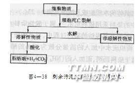 以菌群為主的剩余污泥可以被微生物所分解,而這一分解的關鍵在于微生物細胞的溶解,其控制步驟是細胞壁的生物降解。因此,可以利用水解酸化工藝處理顆粒狀有機物和大分子有機物的優越性,使用兼氧技術處理剩余污泥。 水解酸化工藝中的主要微生物是水解細菌和產酸細菌,針對顆粒狀的剩余污泥,尤其是針對剩余污泥中活性細胞的肽聚糖細胞壁,它們有較強的水解能力。所以,采用水解酸化工藝處理剩余污泥可以順利地將細菌細胞壁水解,并將大分子的細胞物質降解為兩個碳、三個碳的小分子物質,從而有效地溶解剩余污泥,實現剩余污泥減量化。此降解過程如圖4—38所示。