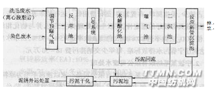 2.寧波某毛紡織有限公司廢水處理 (1)工程概述:寧波某毛紡織有限公司是一家以澳洲羊毛為原料,專業從事毛紡、染色、制衣的企業。生產廢水主要來自洗毛、染色工序。洗毛工序的羊毛洗凈率在70%以上,洗毛廢水中含有凈洗劑、堿等化學成分和大量羊毛脂、羊汗和泥沙等污染物,羊毛脂是造成廢水中COD和BOD的主要成分。染色廢水主要來自條染和匹染車間,工藝中使用的染料主要為酸性和分散染料,以及配套的染化助劑,廢水中污染物濃度相對較低。洗毛廢水主要來自耙式洗毛機第一、第二、第三槽,第四、第五槽較清潔的排水回流到前三槽進行逆流漂洗,每洗凈1t原毛耗水25—35m3,洗毛廢水平均排放量為200mS/d。條染、匹染車間排水為300mS/d。混合廢水量500mS/d。 該公司在20世紀90年代初建有一套廢水處理設施,采用溶氣氣浮(DAP)一混凝沉淀法處理,處理成本高,出水COD遠遠超過國家排脅準,被列入1999年寧波市市長目標限期治理責任制項目。后進行改造,采用渦凹氣浮(CAP)一水解酸化一活性污泥法工藝,在實際生產運行中取得了較好的效果。 。 (2)處理工藝流程:鑒于洗毛染色混合廢水屬于高濃度有機廢水,較適合采用物化生化聯合處理。考慮到洗毛、染色廢水中酸含量較高,且含有大量的羊毛脂、碎毛、洗劑等,宜先經絮凝處理。經試驗,最后確定了鋁鐵復合混凝劑和陰離子聚丙烯酰胺(PAM)作為絮凝劑,并根據同類工程實踐經驗選用了CAF(渦凹氣浮)工藝作為物化處理單元,生化單元采用水解酸化一活性污泥工藝(見圖2—9)。