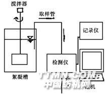 混凝實驗裝置如圖1所示。混凝槽為方形槽,有效容積6.8L。攪拌采用型號為DD60-2F型無級調速攪拌器。用絮凝檢測儀聯機在線檢測混凝過程中絮凝體平均粒徑的變化(用檢測值R反映),記錄儀同時將檢測信號自動記錄。原水用高嶺土和哈爾濱市自來水按標準方法配制而成。用精制硫酸鋁,用NaOH和HCl調整pH值。