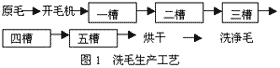 洗毛是羊毛制成品的一個中間環節。由于羊毛在原產地收集時雜質較多,制成品時必須經過一個洗滌過程,產生洗滌廢水。其生產工藝如圖1所示。