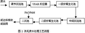 2.1 工藝的確定 洗毛廢水是洗毛生產工藝排出的高濃度有機廢水,其中含有泥沙、羊毛脂、羊糞,還含有少量洗滌劑和羊毛纖維。經化驗分析證明:廢水中羊毛脂多已乳化,以O/W(水包油)形式存在,是組成廢水中BOD5,CODcr的主要成分。其色淡黃、味臭、粘稠、pH值為8.5~9.5,m(BOD5)/m(CODcr)為0.6左右。 根據以上廢水特點,采用厭氧、好氧加混凝沉淀的處理工藝。由于廢水中高濃度的CODcr,BOD5主要是由羊毛脂引起(該廠廢水中羊毛脂含量少,回收價值不大),羊毛脂的化學成分為脂肪酸和高級一元醇化合而成的脂。故先采用厭氧降解高分子物質,而后再用好氧生化,利用好氧微生物的新陳代謝作用去除水中的色度。氣味、粘稠物質等。考慮該公司管理水