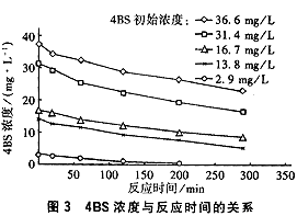 制成一定配比的含硅酸鈉與二氧化鈦的均勻懸濁液(負載溶液),對破碎的耐火磚顆粒(30~40目)載體進行表面處理,然后稱取一定重量的載體浸入負載溶液中,混合均勻后烘干、高溫處理、冷卻。此過程重復數遍后,用超聲波清洗10min,烘干后待用[1]。 1.2.2光催化氧化的工藝條件試驗 向水箱中注滿自來水,再加入4BS溶液,開啟水泵及風機,使4BS溶液混合均勻,15min后測定溶液的吸光度,此過程循環進行,直至達到試驗所需的濃度。然后將500g負載催化劑投 入反應器中,開啟水泵和風機并調節循環流量,使有效反應區內的負載催化劑均勻流化,運行30min,4BS溶液達到吸附平衡后取樣分析。開啟紫外光源,以后每隔一定時間取樣分析。試驗中控制pH=6.5~7.5,曝氣水箱中DO為9.5mg/L,固液分離器中DO為9. 0mg/L。 1.3 分析方法 4BS濃度測定采用分光光度法。測定樣品時,溶液的pH值調至6.5~7.5,用高速離心機(LD5—2A)分離20min后取上清液,用752紫外可見光柵分光光度計于500nm波長處測定溶液的吸光度。